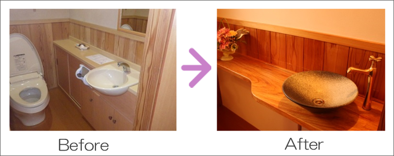 洗面所を全て英国風に。吊棚も全てがお客様が選ばれた特注品です。 元々和風だった扉も、英国風モチーフの扉に。